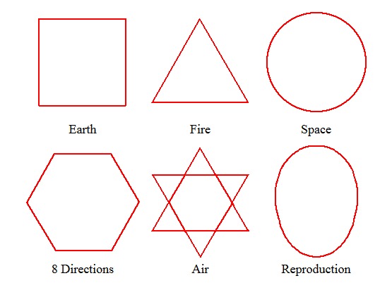 For poojas, velvis and yagnas, large symbols, called chakras, are drawn on the ground and various decorations are placed on top of them. The measurements for the geometric symbols must be as precise as possible. Each symbol represents a different element of nature as shown below. It is very important to include nature in worship because Goddess Adhiparasakthi expresses herself through nature. When done correctly these drawings reveal the Goddess's heartbeat in a manner similar to the way an electrocardiogram reveals ours. In ages past we were much closer to nature and hence to Her, but as we have distanced ourselfs from nature, we have separated ourselfs from God. Utilizing natural elements and symbols representing them helps bring us closer again.